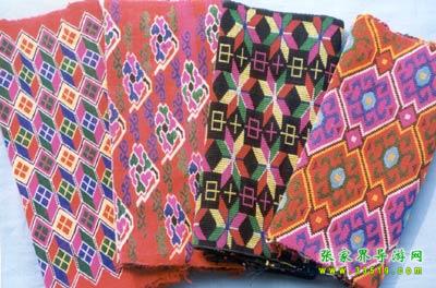 ![]() 織錦。又名“西蘭卡普”、“土花鋪蓋”,為土家族傳統(tǒng)工藝品之一,是森林公園工藝品廠的主要產(chǎn)品??楀\是在特制的本質(zhì)織機上以錦紗為經(jīng)、五彩絲線為緯、手工提花織成。以其質(zhì)地厚實、堅韌,色彩鮮艷,格調(diào)古樸,流暢生動著稱。圖案有花草、鳥獸、生產(chǎn)、生活、幾何、字樣等種類。為舊時土家姑娘必備嫁妝之一。據(jù)考證,早在漢代,土家織錦就作為方物貢入漢室宮廷。20世紀后,土家織錦曾漂洋過海至日、美、英等國展出,并作為禮品,被國家領(lǐng)導人贈送給外國元首及政府官員,如今織錦以壁掛、枕巾、沙發(fā)墊、桌圍、提袋、服飾等多種式樣遠銷世界各地。