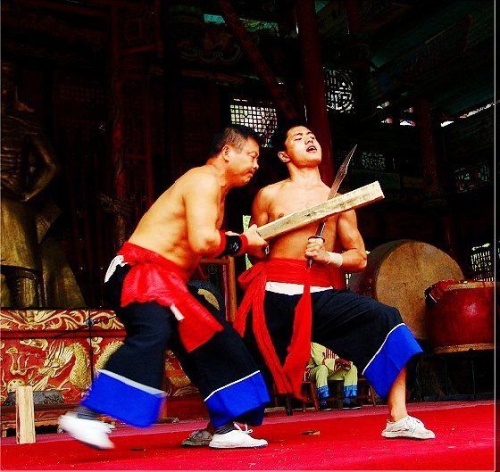 大庸氣功 大庸氣,堪稱武林奇葩,曾為祖國贏得聲譽(yù),海內(nèi)外享有極主名望。 大庸氣功是大庸各民族特別是土家族傳統(tǒng)體育項(xiàng) 目之了,分健體氣派、武術(shù)氣功兩類。前者有“返還 功”、“馬王推氣功”、“少林達(dá)摩醫(yī)療保健氣功” 等;后者有靜坐、壁虎、靈子、二指彈、碎石、松靜 、硬氣、五禽、五陽功等,尤以硬氣功著稱。大庸硬 氣功,歷史悠久,漢代相單程,明代覃后,清代劉明 燈,當(dāng)代湯子模、周鐵鞭、杜心武、趙繼書等都具有 超人硬氣武功。大庸土著民族在漫長的反征服、反壓 迫斗爭,博采武當(dāng)、少林南北派、昆侖派眾家武林精 華,創(chuàng)造出獨(dú)此一家的大庸硬氣功。 據(jù)傳,大庸硬氣功鼻祖是楚國鬼谷子?!?a class="insidelink" href="http://www.nuob.net/cityinfo/15580531721.html" title="永定區(qū)">永定縣 志》有關(guān)鬼谷子隱居天門山鬼谷洞潛心學(xué)《易》、傳 授方術(shù)的記載。到清代有武林高手朱茂嶺,隱居三岔 村北芭蕉灣洞,研究鬼谷氣功之術(shù),后收西溪坪胡口 子、余世萬(即“余通人”)為徙,傳其衣缽。余通 人將武術(shù)氣功系統(tǒng)整理,發(fā)揚(yáng)光大,播名于世。 新中國成立后,黨和政府十分重視民間氣功發(fā)掘 整理,并正式列為體育項(xiàng)目加以普及發(fā)展,今日大庸 市習(xí)練硬氣功達(dá)數(shù)萬人眾。永定區(qū)官黎坪村世有“硬 氣功之鄉(xiāng)”盛譽(yù),該村男女老幼,練功已蔚成風(fēng)氣, 其武師趙繼書,1979年先后參加全省和全國武術(shù)大賽 ,均獲一等獎(jiǎng),受到國家體委重視,同年7 月趙繼書 專程到北京給中央領(lǐng)導(dǎo)同志匯報(bào)表演。嗣后,隨同中 國武術(shù)代表團(tuán)和國家領(lǐng)導(dǎo)人先后兩次出國,到盧森堡 、意大利、比利時(shí)、羅馬尼亞、馬其他和東南亞等國 家訪問。他表演的臥刀碎石、頭頂開石、雙鳳灌耳、 頭碰石柱、叉尖推磨等精彩節(jié)目,博得外國友人好評 。盧森堡一位榮獲國家獎(jiǎng)牌的武士,看了表演后連夜 來到中國大使館,將自己珍藏多年的獎(jiǎng)牌贈送給他; 盧森堡國王主動熱情走上臺與趙繼書熱情擁抱,連連 稱贊:“了不起!了不起!國際氣功大師!”并把珍 藏紀(jì)念章一枚贈送給趙繼書。一位法國朋友十分贊賞 說:“中國的氣功,稱為全人類的寶貴財(cái)富,是有科 學(xué)道理的。”自此,大庸硬氣功譽(yù)滿全球。湖南瀟湘 電影制片廠專門拍攝了彩色紀(jì)錄片《大庸氣功》。 大庸硬氣功共有二十多個(gè)項(xiàng)目,最有影響的是: 腹臥鋼叉 由二人在地面扶住一根叉尖朝上的三 股鋼叉,叉尖猁鋒利,然后一個(gè)俯身叉尖,尖抵腹部 ,待其四肢平展懸空,扶叉二人轉(zhuǎn)動鋼叉,謂之推磨 。表演時(shí),要求臥叉者運(yùn)氣于腹,氣意集中,稍有大 意,叉即穿腹而過。 臥刀破石 先固定兩把大刀,刀口朝上,臥刀者 運(yùn)氣后,由其他人抬臥于刀口上(有仰臥、俯臥兩種) ,然后在臥刀者腹部或背部置一碩大石條(約數(shù)百斤) ,一人或兩人輪大鐵錘狠擊石條直至斷裂破碎為止。 釘?shù)洞财剖?地上倒一層碎玻璃片,一人仰臥其 上;然后腹上置釘床,又一人仰臥釘床上,再于第二 人腹上置釘床,第三人仰臥刀床上,腹部上壓一塊數(shù) 百斤大條石,由人掄錘狠砸,至石破為止。 銀槍刺喉 用一根兩頭安有鋒利槍頭的鋼槍,抵 置兩位表演者喉部,然后相對發(fā)力,至槍桿抵成彎弓 形而喉部安然無恙。 徙手?jǐn)嗍?表演者將堅(jiān)滑如鐵一塊卵石置于石凳 (地)上,然后運(yùn)氣于掌或指擊斷(碎)卵石。 踢腿斬石 表演者運(yùn)氣于腿,以腿踢斷石條。一 般可踢斷15公分以上厚度的麻石條或青石條。 胸部打刀 將鋒利大刀刃口置于胸部肌肉上,用 一根拳頭粗木棒猛擊刀背,至棒斷而胸部無傷。 新中國成立以來,大庸民間武術(shù)與民族體育逐漸 融為一體,發(fā)揮著提高人民身體素質(zhì)、弘揚(yáng)中華武術(shù) 傳統(tǒng)和增進(jìn)國際友誼重大作用。除硬氣功外,還有數(shù) 十種武術(shù)形式散見于民間武術(shù)體育活動之中。如打飛 棒、扭扁擔(dān)、抵搭斗杠、擠油渣、甩抱腰、舉石鎖、 板牛角(一種斗牛形式)等等。其特點(diǎn)是因地制宜, 不分場地,凡田園地角院壩集鎮(zhèn),都是習(xí)武練功、開 展活動的處所,頗具泥土氣息。擬或以生活中某些動 作和動物的某種形態(tài),稍加模仿演繹,便成某一獨(dú)特 武術(shù)形式。如天門武術(shù)功夫大師余道人所創(chuàng)造的“宮 天梳”、“巖燕樸天門”等;也有就地理特點(diǎn)創(chuàng)造某 種武功形式的,如“蕩藤”等。 以上部分圖片均來自互聯(lián)網(wǎng),出處不詳,請作者與本站聯(lián)系。 |
