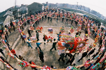 龍舞是中國(guó)民間體育藝術(shù)。大庸境內(nèi)的板凳龍是 別具一格的龍舞形式。尤其桑植縣白族人民,對(duì)舞板 凳龍有著特殊偏愛。 白族同胞耍板凳龍,相傳起于漢代,由白族先民 “舞龍求雨”的宗教活動(dòng)演變而來。 板凳龍有兩種樣式。一種是簡(jiǎn)式板凳龍,由二個(gè) 舉長(zhǎng)凳為頭,一人在后選適當(dāng)“舞臺(tái)”表演;另一種 是“篾扎板凳龍”,即用竹篾扎成龍形置于板凳之上 ,以木腳示龍爪,造型美觀,逼真。耍板凳龍又分兩 種舞式,一為獨(dú)凳龍,一為九節(jié)龍(九張板凳相接)。 舞板凳龍動(dòng)作有“二龍搶珠”、“黃龍穿花”、“二 龍戲水”、“金蟬脫殼”、“黃龍盤身”等。永順、 慈利還流行草把龍,其龍耳稻草扎成。龍舞還有“干 龍”、“濕龍”之分,“干龍”多為娛樂,“濕龍” 則為求雨。“龍”到之處,百姓必潑水助威,舞者一 身透濕,盛為熱烈歡快。