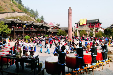 三棒鼓,唐代稱三仗鼓,明沈行符《顧曲雜言》 曰:“吳下何來有打三棒鼓乞錢者,余幼時(shí)有見之也, 起于唐咸通中(公元865年)”約于明代傳入本境, 并逐漸成為群眾增聞樂見的民間藝術(shù)形式。每年春節(jié) ,藝人們結(jié)伴走村竄寨拜年,表演對(duì)象不分貧富,戶 戶必到。如遇貧寒之家,表演者將別家贈(zèng)送禮品相送 ,意在人人過節(jié)歡喜。充分體現(xiàn)出土家族人熱情好客 ,心地善良的民族性格,對(duì)加強(qiáng)民族團(tuán)結(jié)有一定作用 。 三棒鼓通常由三至五人組成,一人擊鼓唱詞,一 人鑼鈸配樂,一人?;ò簟;ò羧?,長(zhǎng)一尺,舞者 左右手各持一根,將另一根拋在空中,左右開弓,擊 打空中花棒使之不落地。也有以刀代棒,以五刀代三 棒的技藝。技藝高強(qiáng)者,突然把刀拋得極高,來一個(gè) 眼花繚亂,不禁稱絕。打三棒鼓,通常有“鬧春耕” 、“收割打場(chǎng)”、“慶豐收”、“拜年節(jié)”四套,分 “鯉魚跳龍門”、“玉女穿梭”、“板巖漂灘”等項(xiàng) 目。打三棒鼓技巧性強(qiáng),表演時(shí)需高度集中,用力適 當(dāng),貫通一氣,并與演唱者默默配合。
