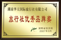 2007旅行社優(yōu)秀品牌獎 湖南省旅游局 (2007.3)