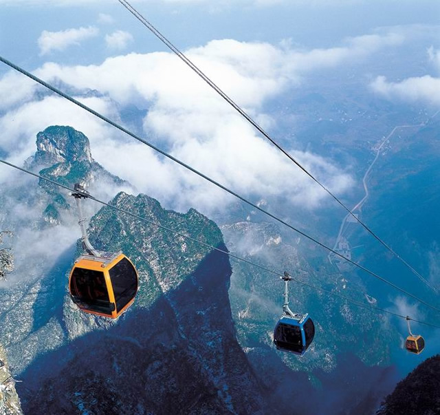 ②、張家界天門山索道為全世界最長(zhǎng)的觀光客運(yùn)索道,索道線路斜長(zhǎng)7455 米,索道運(yùn)行速度為每秒 6 米,單程運(yùn)行時(shí)間約28分鐘。上、下站水平高差1279米主要設(shè)備均由法國(guó)POMA公司原裝進(jìn)口,索道鋼繩來(lái)自于法國(guó), 98 個(gè)吊廂來(lái)自瑞士 CWA 公司,單個(gè)造價(jià)高達(dá) 20 萬(wàn)元人民幣。有嚴(yán)重心臟病或恐高癥等患者不建議乘坐;
