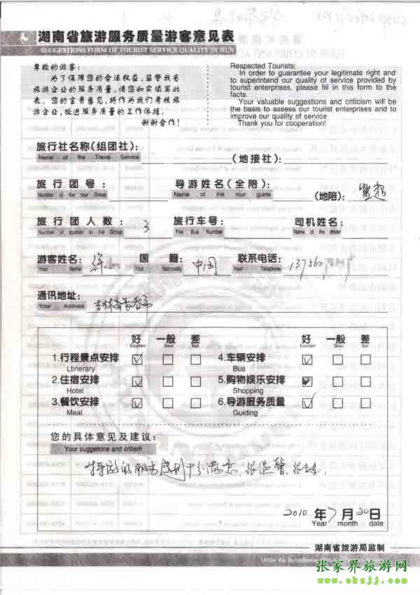 2010年7月20日吉林徐先生一行3位旅游質(zhì)量反饋:對導(dǎo)游十分滿意