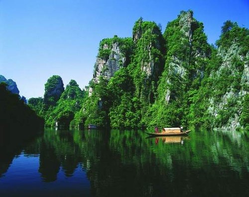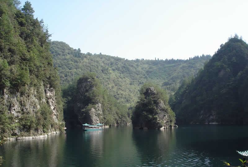 其位于武陵源區(qū)城南1.5公里處,是武陵源風(fēng)景名勝中的精品景點(diǎn)。它是一座罕見的高峽平湖,四面青山,一泓碧水,風(fēng)光旖旎,是山水風(fēng)景杰作。在此蕩舟,還可見到湖心島上“玉瓶開花”、“十女梳妝”、“金龜戲水”、“青蛙鬧春”等佳景。 寶峰湖是一個(gè)截流筑壩而成 的人工湖,深72米,長2.5米公里, 以其秀麗的湖光 水色與幽野的洞天情趣成為武陵源水景風(fēng)光的代表之 作。湖中有兩座疊翠小島,近岸奇峰屹立,峰回水轉(zhuǎn)。