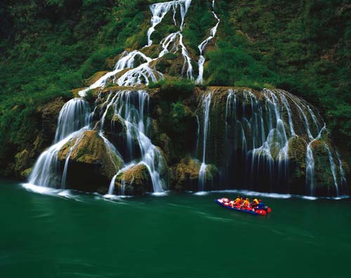 在金鞭溪游覽過程中,可見一組奇峰,有兩座較高的石峰緊密相連,下半截連為一體,上半截一高一矮,高者略欠身,低者稍后仰,好一幅相愛擁抱的絕妙畫面,恰似一對久別重逢的夫妻,故名相會峰,亦稱千里相會。相傳東海龍宮小龍女常來此地觀賞風(fēng)景,一次偶然的機(jī)會,結(jié)識了峨眉山遠(yuǎn)道而來的后生,二人情投意合,很快便產(chǎn)生了愛情。龍王知道此事以后,非常惱怒,決意拆散二人,多次將小龍女關(guān)在龍宮,但小龍女想方設(shè)法逃出來,常常與情人相會。龍王一氣之下,將二人點(diǎn)化成石,便成石峰“千里相會”。 十一、茅巖河漂流